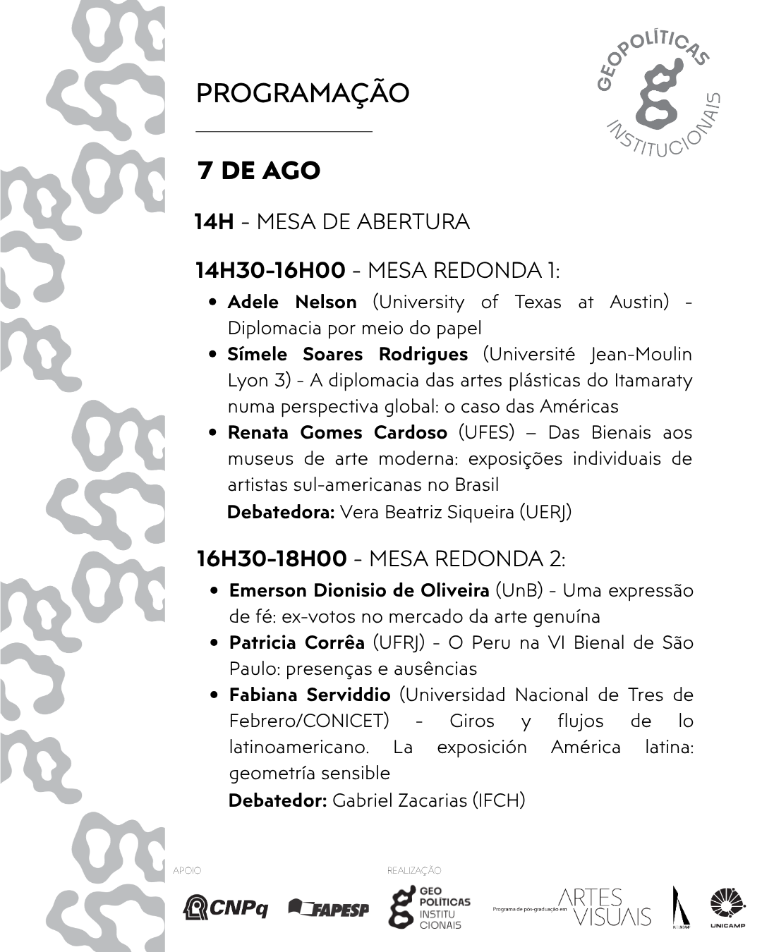 - Fabiana Serviddio (Universidade Nacional de Tres de Febrero / CONICET) — Giros y flujos de lo latinoamericano. La exposicón América latina: geometria sensible. Debatedor: Gabriel Zacarias (IFCH)