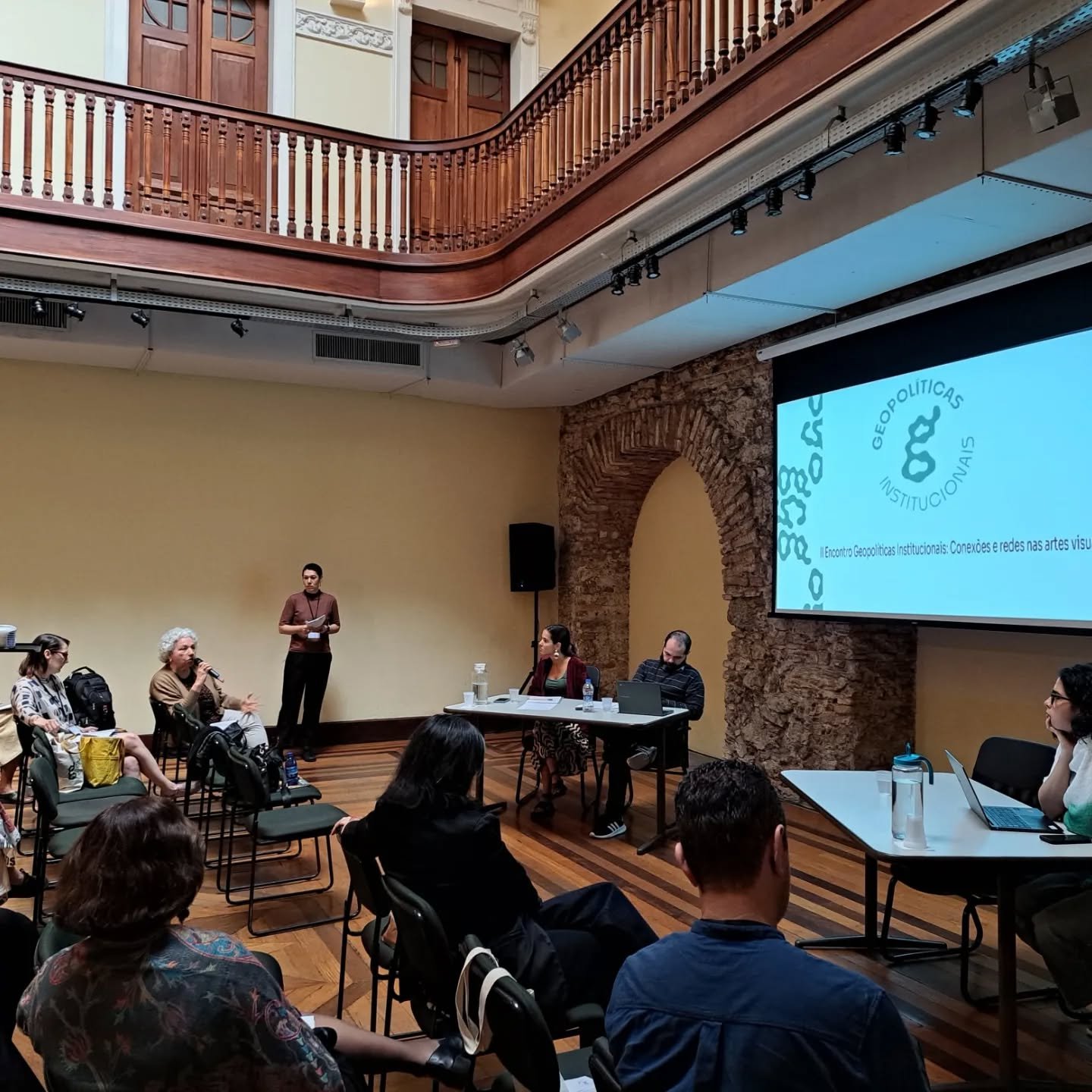 Último dia de discussões do II Encontro Geopolíticas Institucionais: conexões e redes nas artes visuais e começamos com a mesa redonda “Redes e fluxos: Brasil e América Latina 2”, que contou com as falas de Hellen Alves Cabral (UFRJ), “Modernismos em rede: trânsitos da arte têxtil de Aldo Bonadei no Brasil dos anos 1950”; Martha Telles (UERJ), “Cildo Meireles na exposição Information (1970)”; Tiago Machado (IFSP), “Arthur Barrio and Cildo Meireles in the Documenta 11”; e Ornela Barisone (Universidad Nacional de San Martín / CONICET), “Redes experimentales y archivos: la participación brasileña en la Exposición Internacional de Novísima Poesía/69”.